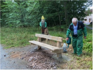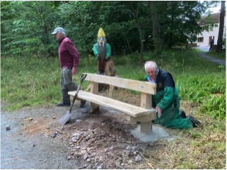The Burn of Fochabers cementing in place the finished oak bench we completed. Below some of the Cricket club benches completed